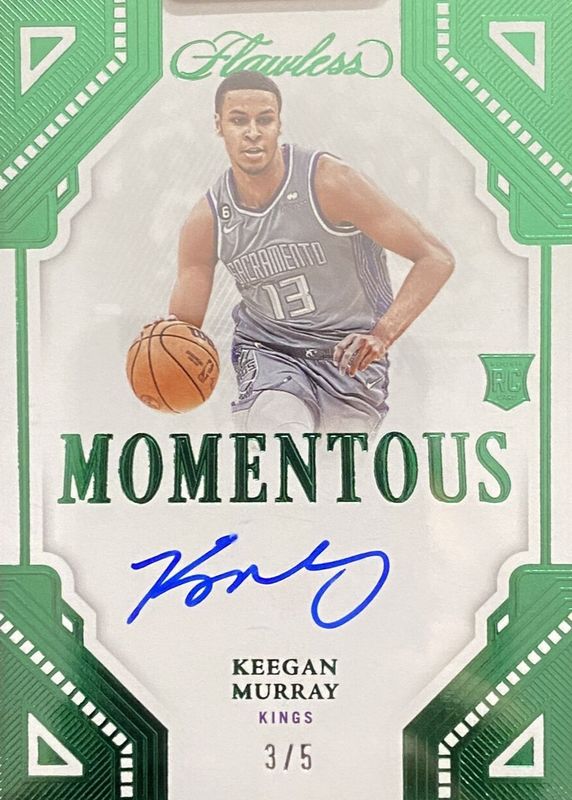 The Keegan Murray 2022 Flawless #MA-KGM Momentous Autographs - Emerald /5 Rookie card in Raw condition has not changed in price in the last 30 days and was last sold for $300.00 .