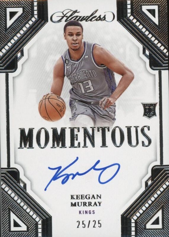 The Keegan Murray 2022 Flawless #MA-KGM Momentous Autographs /25 Rookie card in Raw condition has not changed in price in the last 30 days and was last sold for $52.55 .