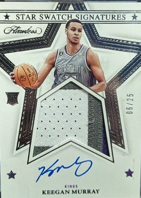 The Keegan Murray 2022 Flawless #SSS-KGM Star Swatch Signatures (/25) Rookie card in Raw condition has not changed in price in the last 30 days and was last sold for $700.00 .