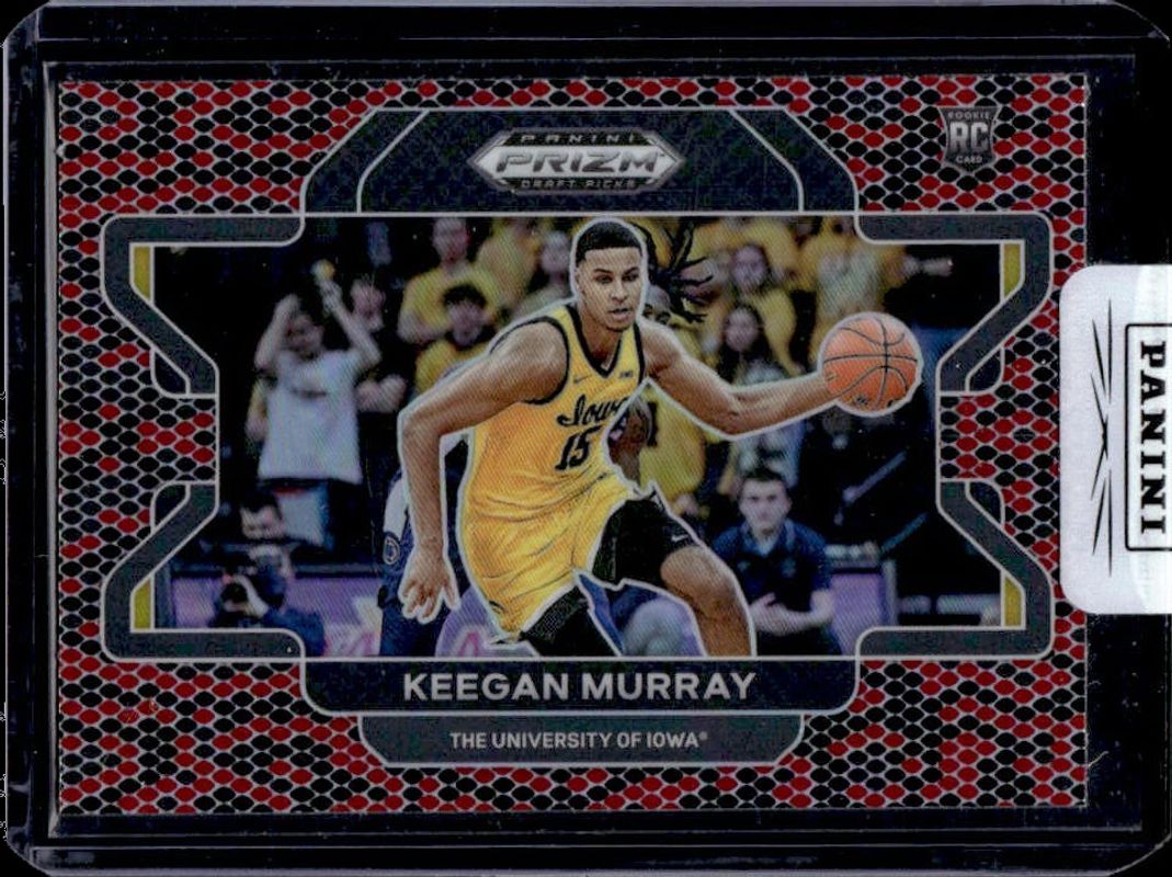 The Keegan Murray 2022 Prizm Draft Picks #55b Venom Snakeskin Rookie card is 1 of 158 Keegan Murray's card variations in the 2022 Prizm Draft Picks set being tracked by Sports Card Investor, including #55 Base, #55b Base, #55 Blue Circles, #55b Choice Blue Yellow & Green, and #55 Choice Blue Yellow & Green.