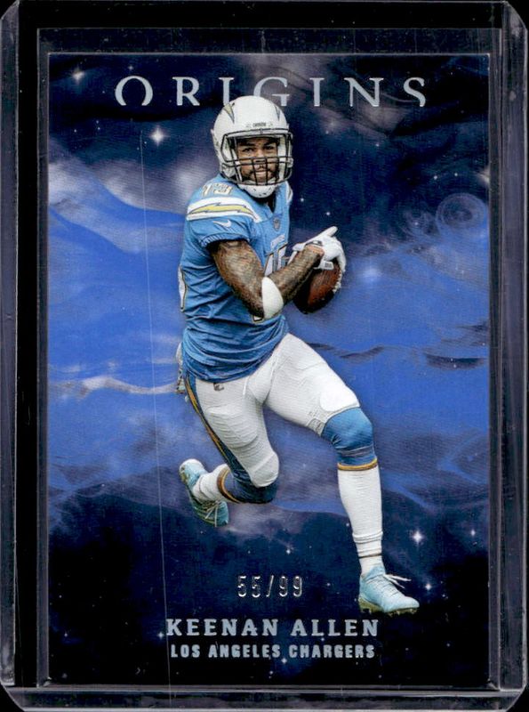 The Keenan Allen 2019 Origins #48 Blue /99 card is 1 of 17 Keenan Allen's card variations in the 2019 Origins set being tracked by Sports Card Investor, including Base, Red /299, Orange /175, Turquoise /25, and FOTL Purple /13.