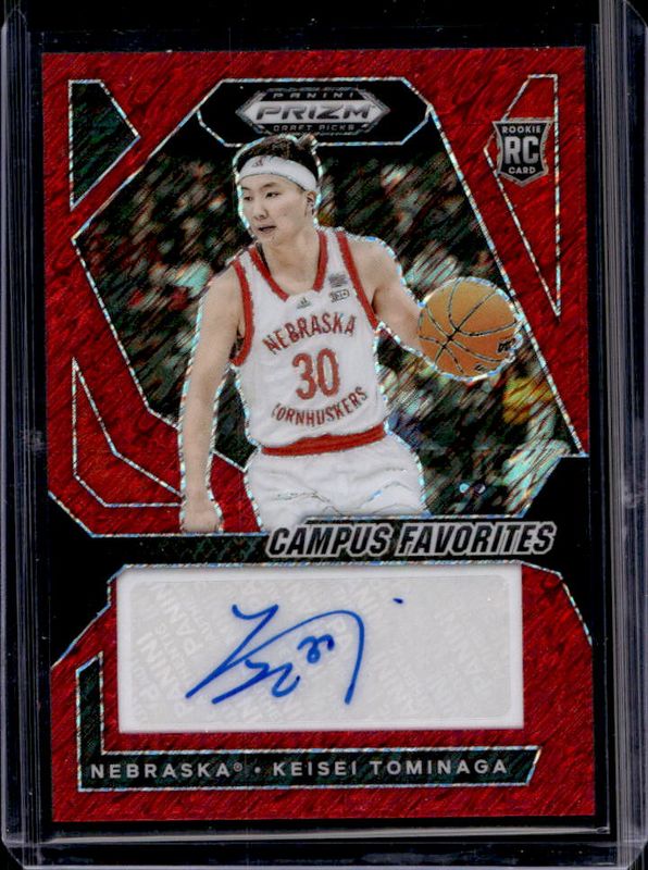 The Keisei Tominaga 2024 Prizm Draft Picks #CFS-KEI Campus Favorites Signatures - Red Shimmer /11 card is 1 of 57 Keisei Tominaga's card variations in the 2024 Prizm Draft Picks set being tracked by Sports Card Investor, including Base, Green, Green Wave, Hyper, and Orange Ice.