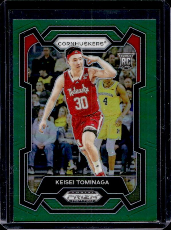 The Keisei Tominaga 2024 Prizm Draft Picks #26 Green card is 1 of 57 Keisei Tominaga's card variations in the 2024 Prizm Draft Picks set being tracked by Sports Card Investor, including Base, Green Wave, Hyper, Orange Ice, and Purple Wave.