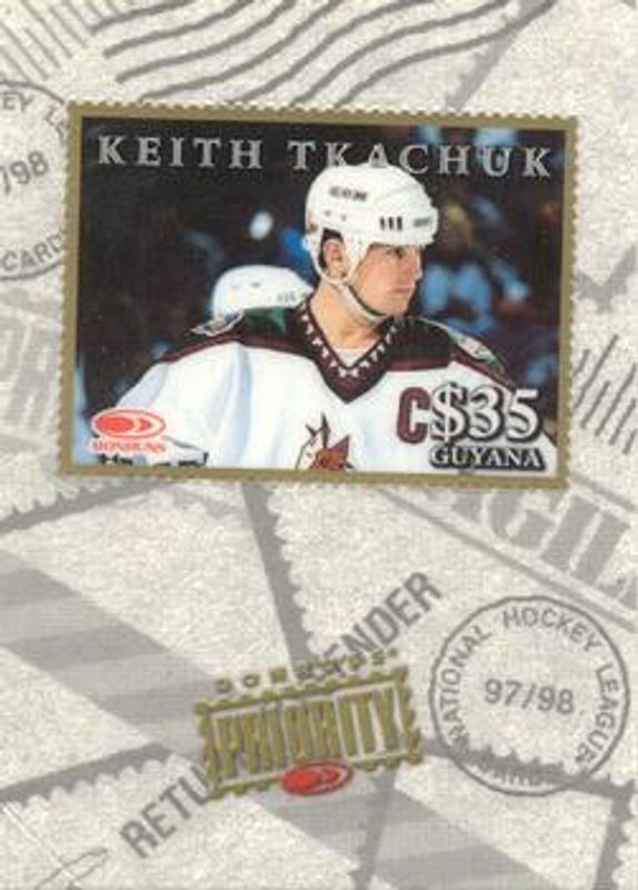 The Keith Tkachuk 1997 Donruss Priority Stamps Gold card is 1 of 12 Keith Tkachuk's card variations in the 1997 Donruss Priority set being tracked by Sports Card Investor, including #3 Base, #202 Base, #17 Direct Deposit Promos, #202 Stamp of Approval /100, and #3 Stamp of Approval /100.