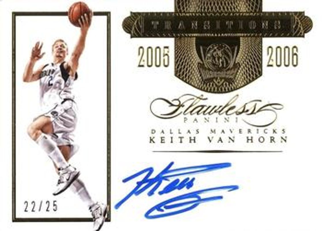 The Keith Van Horn 2015 Flawless #TR-KH5 Transitions /25 card is 1 of 20 Keith Van Horn's card variations in the 2015 Flawless set being tracked by Sports Card Investor, including #SS-KH Super Signatures /25, #TR-KV2 Transitions /25, #TR-KV1 Transitions /25, #TR-KV4 Transitions /25, and #TR-KV3 Transitions /25.