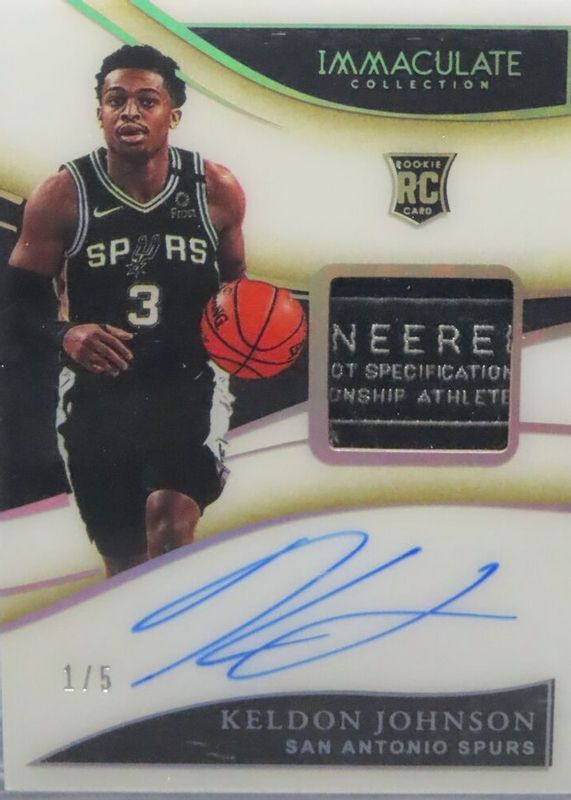 This card is 1 of 6 Keldon Johnson's card variations in the 2019 Immaculate set being tracked by Sports Card Investor, including Rookie Patch Auto - Jersey Number (/3), Rookie Patch Auto /99, Rookie Patch Auto - Red /25, Rookie Patch Auto - Gold /10, and Rookie Patch Auto - Logoman /1.