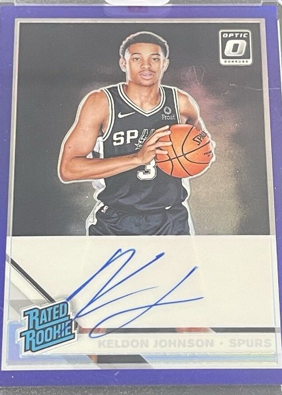 The Keldon Johnson 2019 Optic #186 Rated Rookie Signatures - Purple card in Raw condition has not changed in price in the last 30 days and was last sold for $33.75 .