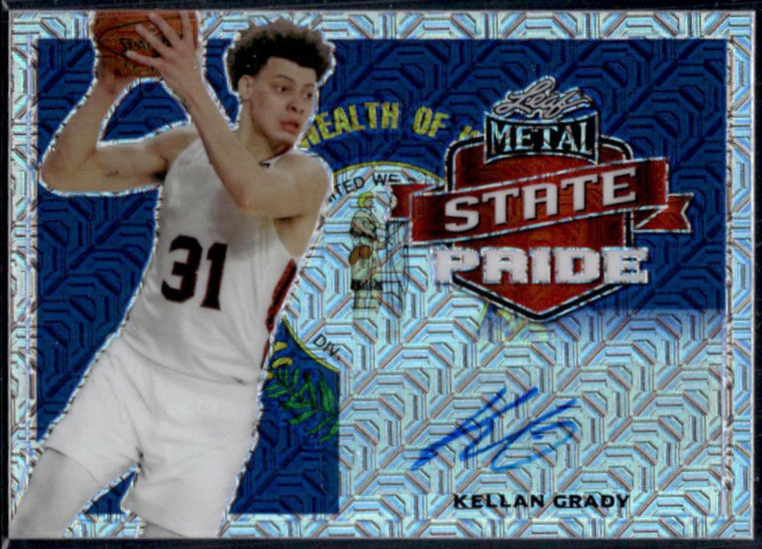 The Kellan Grady 2021 Leaf Metal #SP-KG1 State Pride Autographs - Silver Mojo card is 1 of 88 Kellan Grady's card variations in the 2021 Leaf Metal set being tracked by Sports Card Investor, including Base, Silver Crystal, Silver Mojo, Silver Wave, and Blue Rainbow /50.