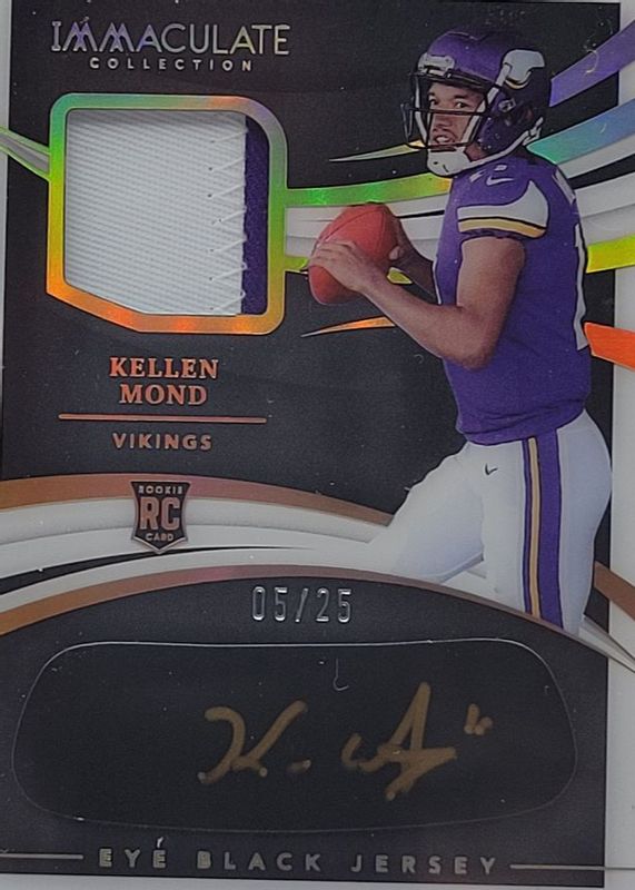 The Kellen Mond 2021 Immaculate #REB-KM Immaculate Rookie Eye Black Jersey Autographs - Gold (/25) card in Raw condition has not changed in price in the last 30 days and was last sold for $9.83 .