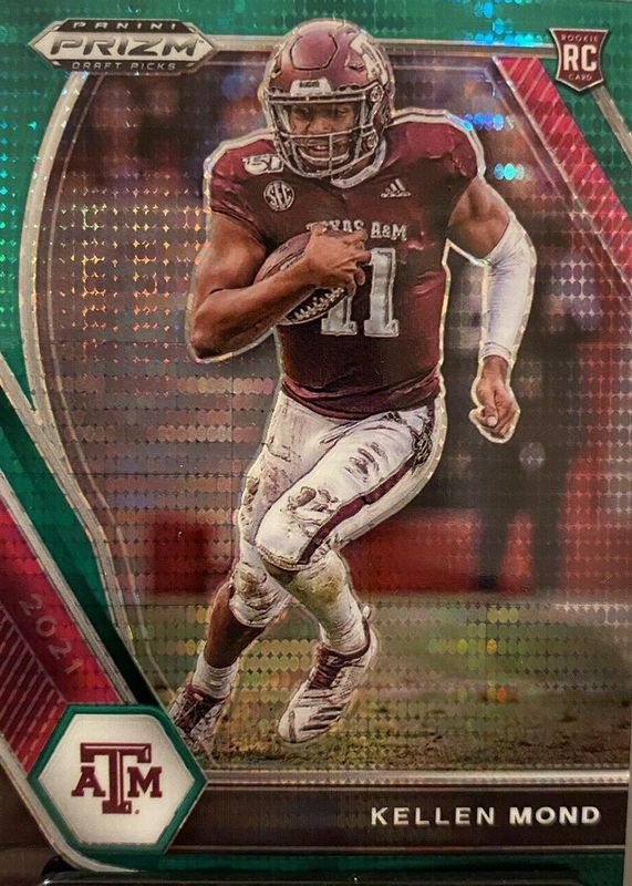 This card is 1 of 5 Kellen Mond's card variations in the 2021 Prizm Draft Picks set being tracked by Sports Card Investor, including Base, Green, Purple Wave, and Silver.