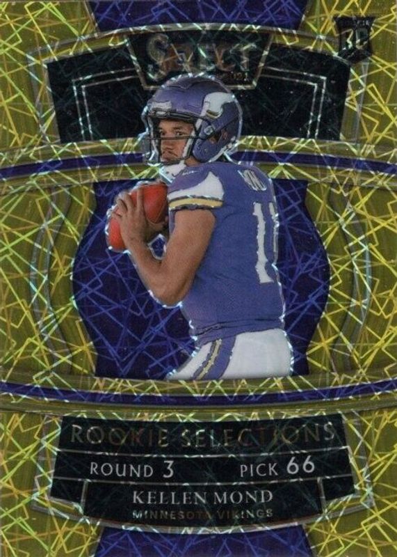 The Kellen Mond 2021 Select #RS-20 Rookie Selections - Gold /10 card in Raw condition has not changed in price in the last 30 days and was last sold for $3.25 .