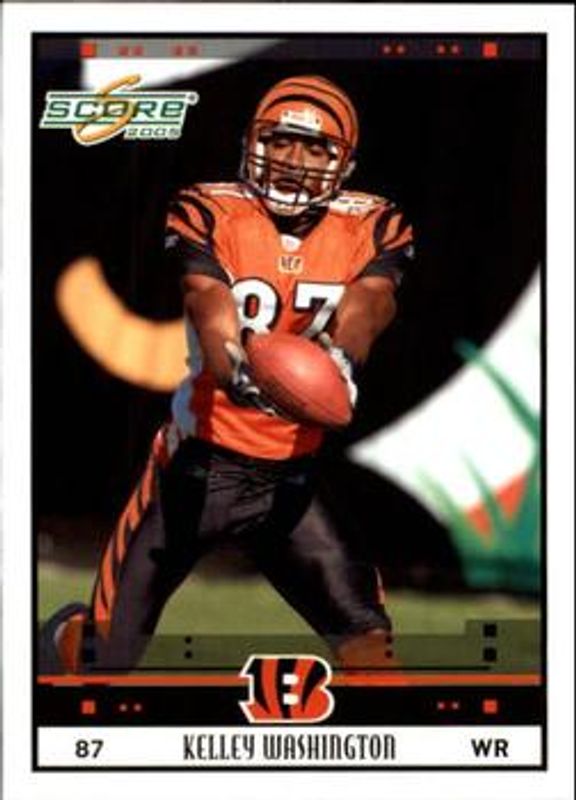 The Kelley Washington 2005 Score #58 Base card is 1 of 6 Kelley Washington's card variations in the 2005 Score set being tracked by Sports Card Investor, including Glossy, Scorecard /599, Adrenaline /399, Revolution /199, and Final Score /17.