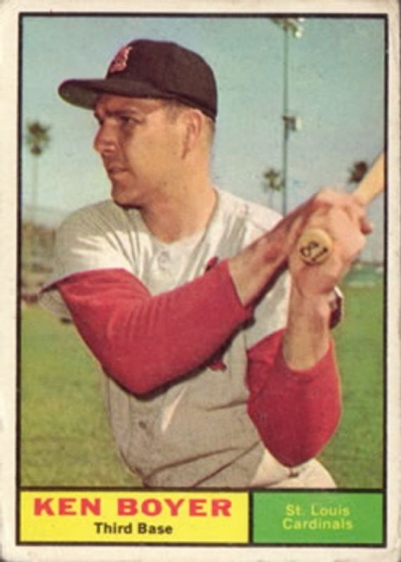 The Ken Boyer 1961 Topps #375 Base card is 1 of 3 Ken Boyer's card variations in the 1961 Topps set being tracked by Sports Card Investor, including Base, and Stamps.