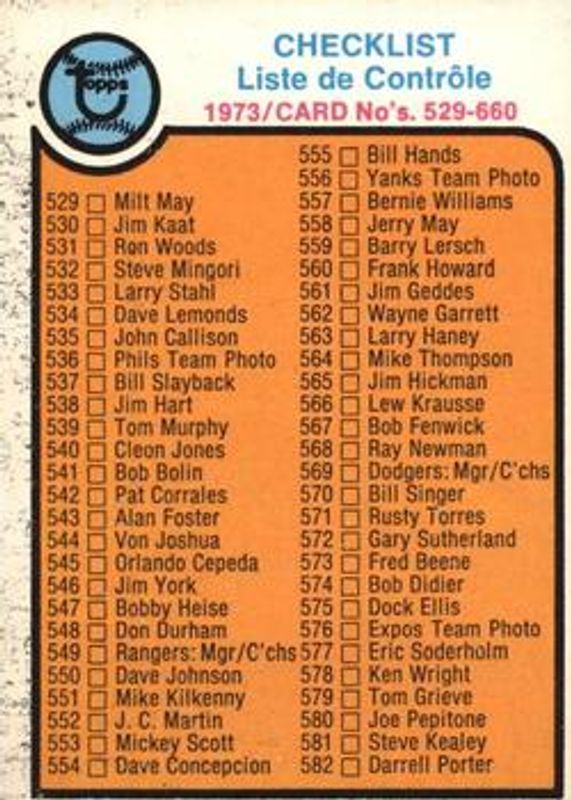 Other popular players in the 1973 O-Pee-Chee set include World Series, Checklist, Bernie Allen / Bernie Williams, Tom Hall, and Al Downing.