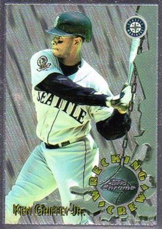 The Ken Griffey Jr. 1996 Topps Chrome #WC9 Wrecking Crew card is 1 of 8 Ken Griffey Jr.'s card variations in the 1996 Topps Chrome set being tracked by Sports Card Investor, including #70 Base, #90 Base, #90 Star Power, #90 Refractor, and #70 Refractor.
