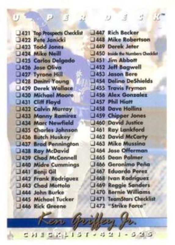 Other popular players in the 1993 Upper Deck set include Checklist, Roberto Alomar, Kirby Puckett, Juan Gonzalez, and Reggie Jackson.