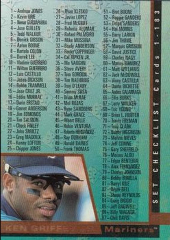 The Ken Griffey Sr. 1997 SP #183 Base card is 1 of 21 Ken Griffey Sr.'s card variations in the 1997 SP set being tracked by Sports Card Investor, including Base, Inside Info, Marquee Matchups, Special FX, and Baseball Heroes: Ken Griffey, Jr. /2000.
