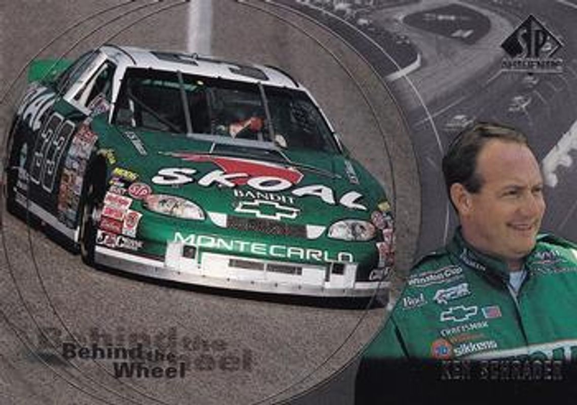 The Ken Schrader 1998 SP Authentic #BW9 Behind the Wheel card is 1 of 6 Ken Schrader's card variations in the 1998 SP Authentic set being tracked by Sports Card Investor, including #22 Base, #56 Base, #83 Base, #BW9 Behind the Wheel - Gold, and #BW9 Behind the Wheel Die-Cut /100.
