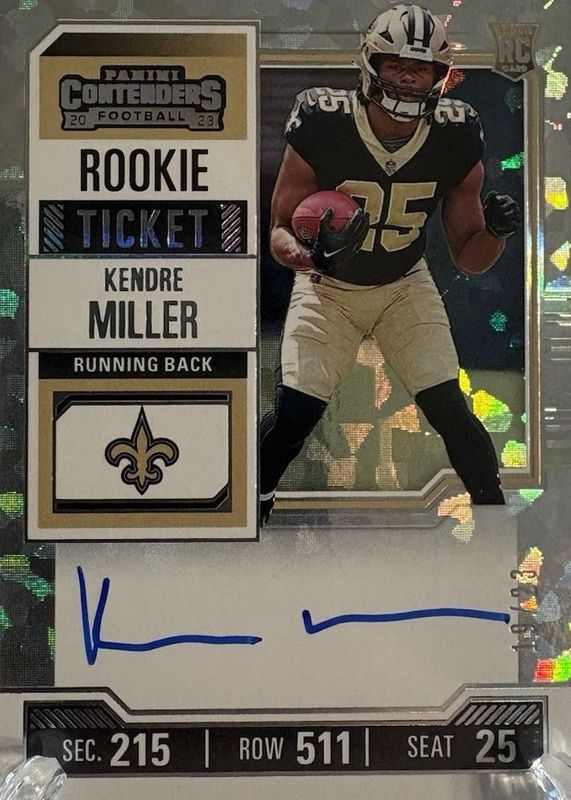 This card is 1 of 29 Kendre Miller's card variations in the 2023 Contenders set being tracked by Sports Card Investor, including Rookie Ticket Auto, Rookie Ticket Auto - Opening Kickoff Ticket, Rookie Ticket Auto - Red Zone Ticket, Rookie Ticket Auto - Ticket Stub (/25), and Rookie Ticket Auto Variation.