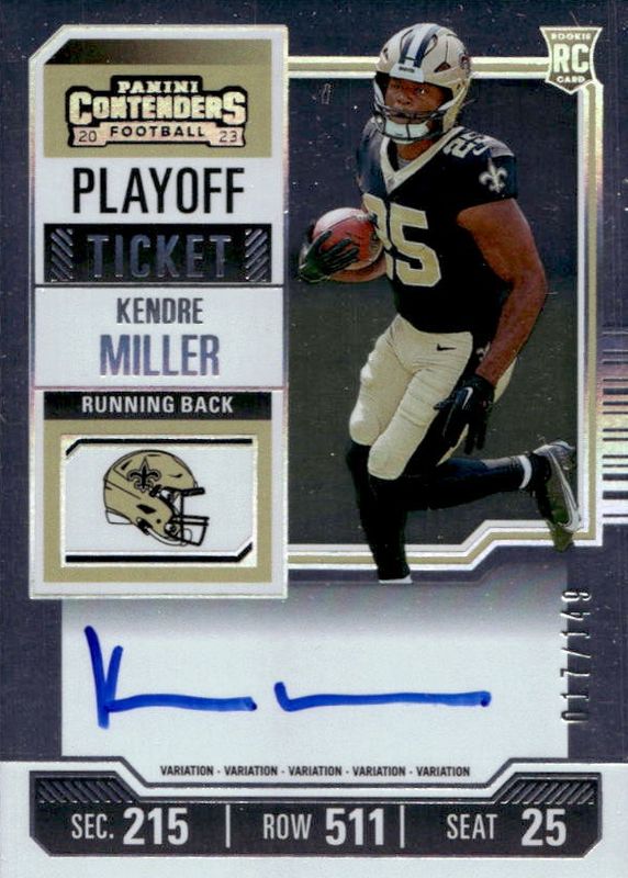 This card is 1 of 29 Kendre Miller's card variations in the 2023 Contenders set being tracked by Sports Card Investor, including Rookie Ticket Auto, Rookie Ticket Auto - Opening Kickoff Ticket, Rookie Ticket Auto - Red Zone Ticket, Rookie Ticket Auto - Ticket Stub (/25), and Rookie Ticket Auto Variation.