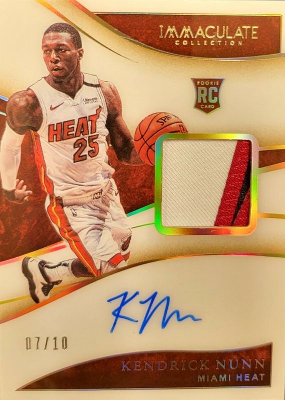 This card is 1 of 6 Kendrick Nunn's card variations in the 2019 Immaculate set being tracked by Sports Card Investor, including Rookie Patch Auto - Jersey Number (/25), Rookie Patch Auto /99, Rookie Patch Auto - Red /25, Rookie Patch Auto - Tag /5, and Rookie Patch Auto - Logoman /1.
