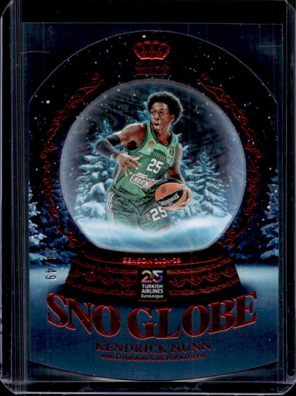 The Kendrick Nunn 2024 Crown Royale EuroLeague #5 Sno Globe - Red /49 card is 1 of 18 Kendrick Nunn's card variations in the 2024 Crown Royale EuroLeague set being tracked by Sports Card Investor, including Base, Royalty, Crystal Red /49, Crystal Purple /25, and Crystal Gold /10.