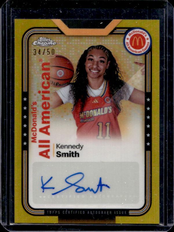 The Kennedy Smith 2024 Topps Chrome McDonald's All-American #SMS-KEN All-American Autographs - Gold Refractor /50 card is 1 of 112 Kennedy Smith's card variations in the 2024 Topps Chrome McDonald's All-American set being tracked by Sports Card Investor, including #73 Base, #23 Base, #23 Blue RayWave Refractor, #73 Blue RayWave Refractor, and #23 McDonald's Logo Refractor.