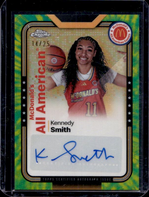 The Kennedy Smith 2024 Topps Chrome McDonald's All-American #SMS-KEN All-American Autographs - Tie-Dye Refractor /25 card is 1 of 112 Kennedy Smith's card variations in the 2024 Topps Chrome McDonald's All-American set being tracked by Sports Card Investor, including #73 Base, #23 Base, #23 Blue RayWave Refractor, #73 Blue RayWave Refractor, and #23 McDonald's Logo Refractor.