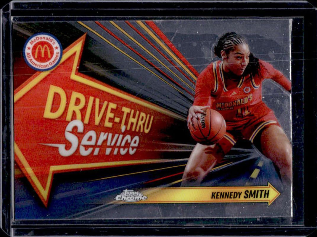 The Kennedy Smith 2024 Topps Chrome McDonald's All-American #DTS-KES Drive-Thru Service card is 1 of 112 Kennedy Smith's card variations in the 2024 Topps Chrome McDonald's All-American set being tracked by Sports Card Investor, including #73 Base, #23 Base, #23 Blue RayWave Refractor, #73 Blue RayWave Refractor, and #23 McDonald's Logo Refractor.