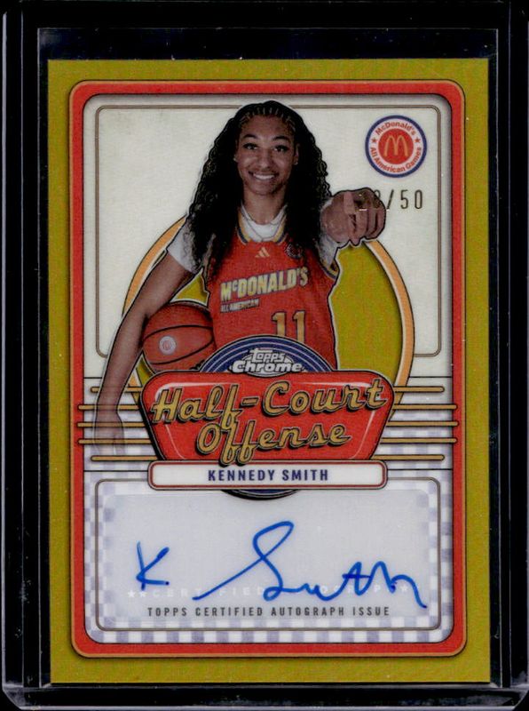 The Kennedy Smith 2024 Topps Chrome McDonald's All-American #IML-KES Half-Court Signatures - Gold Refractor /50 card is 1 of 112 Kennedy Smith's card variations in the 2024 Topps Chrome McDonald's All-American set being tracked by Sports Card Investor, including #73 Base, #23 Base, #23 Blue RayWave Refractor, #73 Blue RayWave Refractor, and #23 McDonald's Logo Refractor.