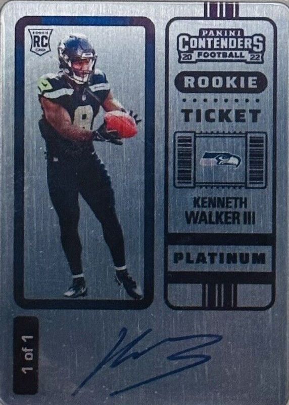 The Kenneth Walker III 2022 Contenders #126 Rookie Ticket Auto - Platinum /1 card in Raw condition has not changed in price in the last 30 days and was last sold for $1,049.00 .