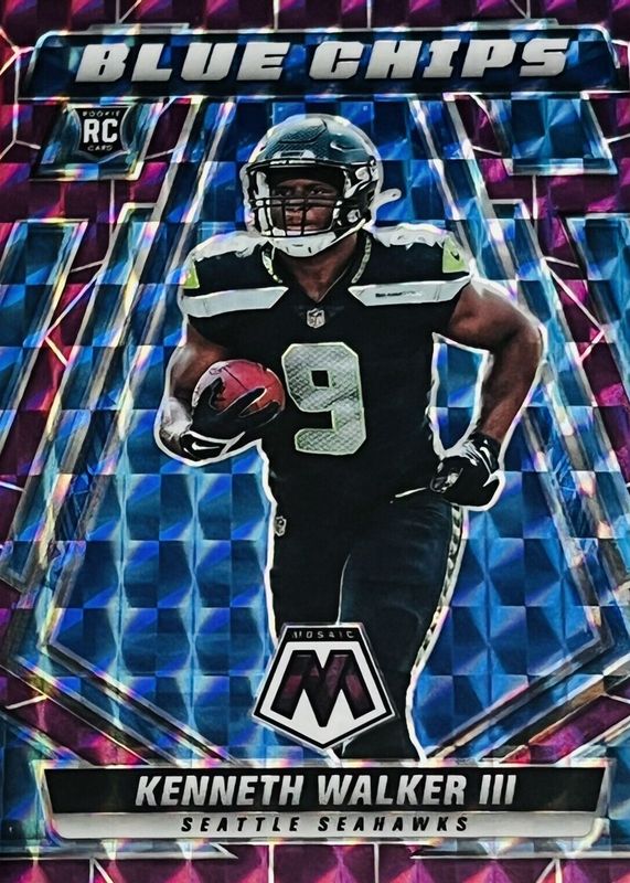The Kenneth Walker III 2022 Mosaic #BC-13 Blue Chips - Purple /49 Rookie card in Raw condition has not changed in price in the last 30 days and was last sold for $3.25 .