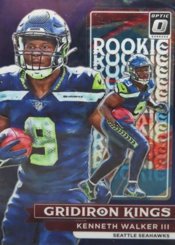 The Kenneth Walker III 2022 Optic #RGK-14 Rookie Gridiron Kings - Purple Stars /25 card in Raw condition has not changed in price in the last 30 days and was last sold for $13.50 .