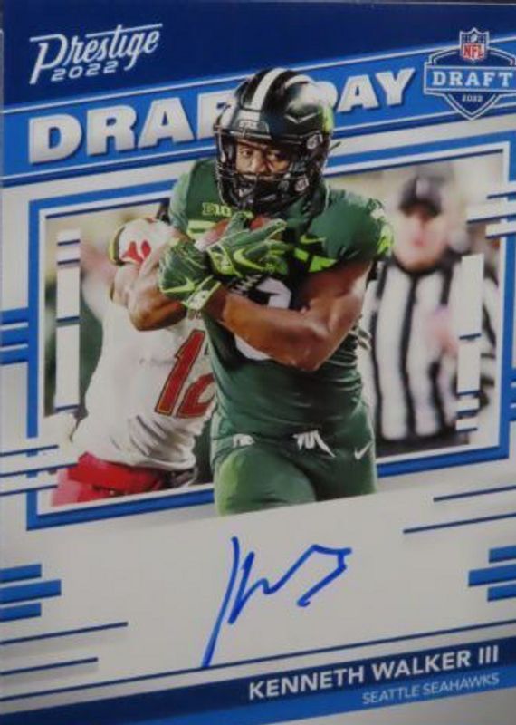 The Kenneth Walker III 2022 Prestige #DDS-KW Draft Day Signatures Rookie card in Raw condition has not changed in price in the last 30 days and was last sold for $15.50 .