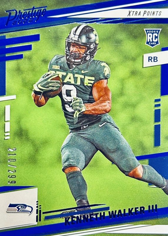 The Kenneth Walker III 2022 Prestige #314 Xtra Points Blue /299 Rookie card in Raw condition has not changed in price in the last 30 days and was last sold for $0.99 .