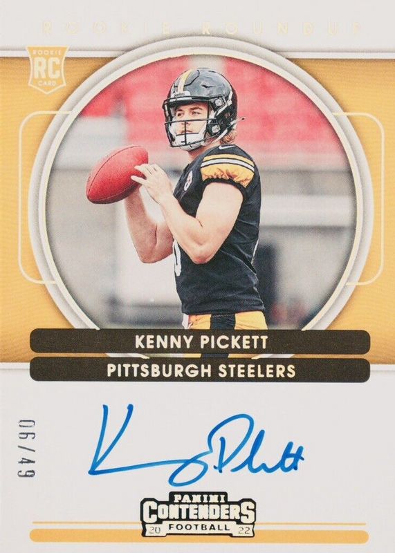 The Kenny Pickett 2022 Contenders #RRA-KPI Rookie Roundup Autographs (/49) card in Raw condition has not changed in price in the last 30 days and was last sold for $70.00 .