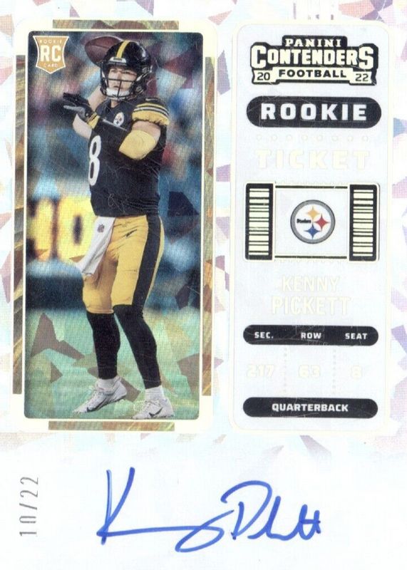 The Kenny Pickett 2022 Contenders #127 Rookie Ticket Auto - Cracked Ice Ticket /22 card in Raw condition has not changed in price in the last 30 days and was last sold for $810.00 .