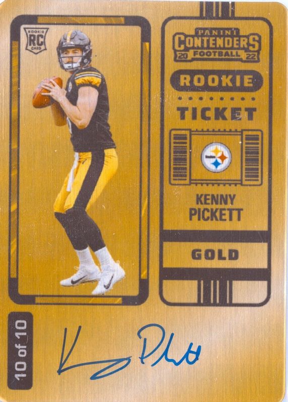The Kenny Pickett 2022 Contenders #127 Rookie Ticket Auto - Gold /10 card in Raw condition has not changed in price in the last 30 days and was last sold for $175.00 .