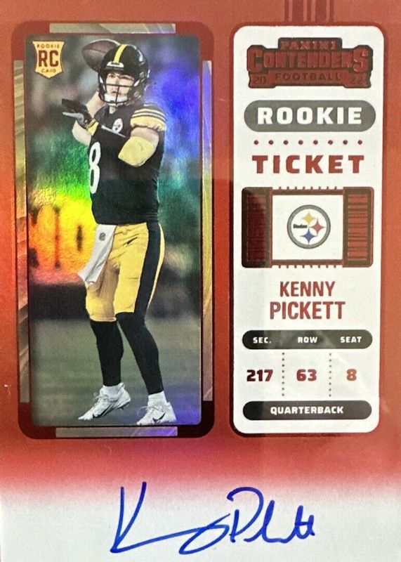 The Kenny Pickett 2022 Contenders #127 Rookie Ticket Auto - Red Zone Ticket card in Raw condition has not changed in price in the last 30 days and was last sold for $10.35 .