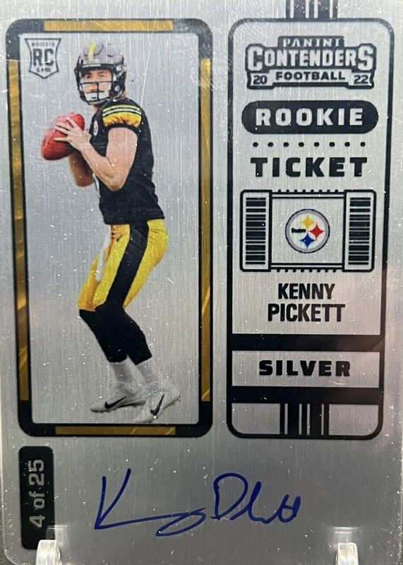The Kenny Pickett 2022 Contenders #127 Rookie Ticket Auto - Silver (/25) card in Raw condition has not changed in price in the last 30 days and was last sold for $12.50 .