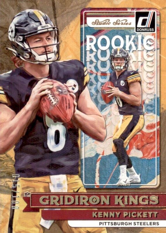 The Kenny Pickett 2022 Donruss #RGK-1 Rookie Gridiron Kings - Studio Series /100 card in Raw condition has not changed in price in the last 30 days and was last sold for $4.99 .