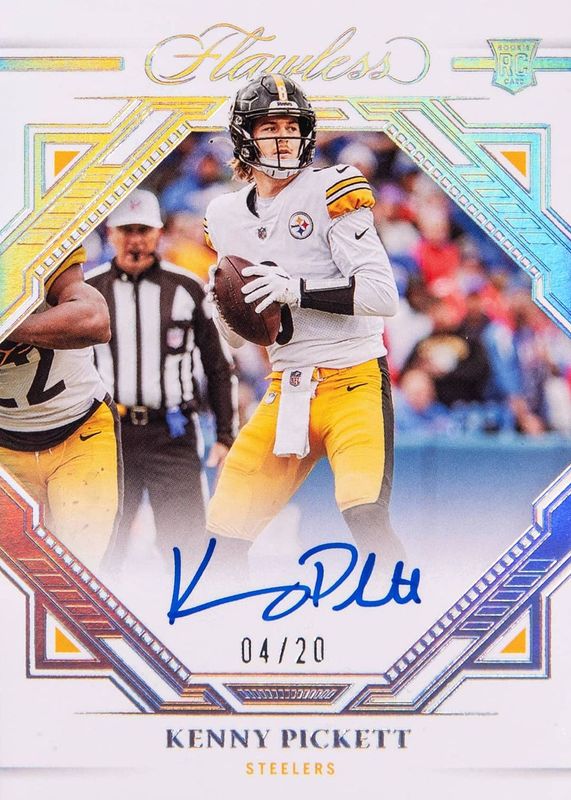 This card is 1 of 50 Kenny Pickett's card variations in the 2022 Flawless set being tracked by Sports Card Investor, including Rookie Debut Signatures (/25), Rookie Debut Signatures - Ruby (/15), Rookie Debut Signatures - Sapphire (/10), Rookie Debut Signatures - Silver (/20), and Rookie Frame Signatures (/25).