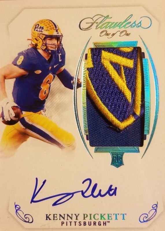 The Kenny Pickett 2022 Flawless #RPA-KP Rookie Patch Auto - Platinum /1 card in Raw condition has not changed in price in the last 30 days and was last sold for $1,200.00 .