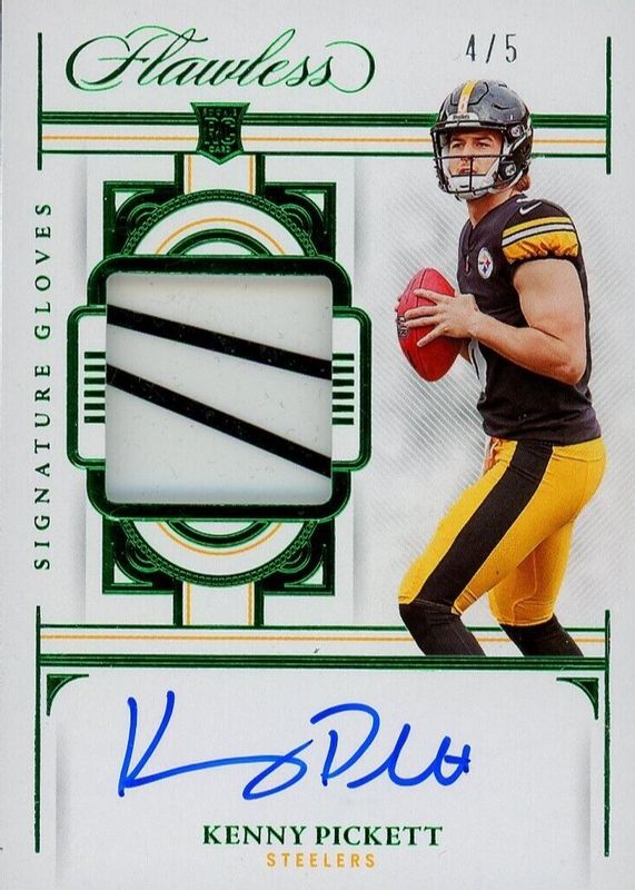 The Kenny Pickett 2022 Flawless #SG-KP Signature Gloves - Emerald /5 Rookie card in Raw condition has not changed in price in the last 30 days and was last sold for $225.00 .
