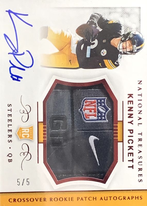 The Kenny Pickett 2022 National Treasures #CRPA-KP Crossover Rookie Patch Autographs - Laundry Tag /5 card in Raw condition has not changed in price in the last 30 days and was last sold for $700.00 .