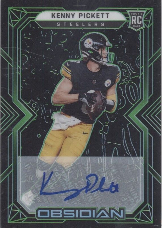 The Kenny Pickett 2022 Obsidian #104 Rookie Autographs - Electric Etch Green /50 card in Raw condition has not changed in price in the last 30 days and was last sold for $10.50 .
