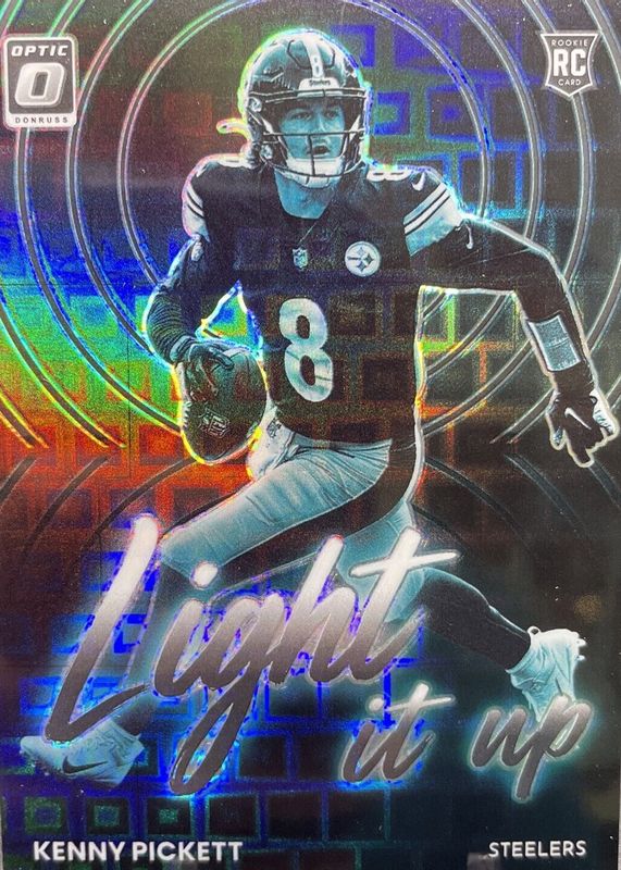 The Kenny Pickett 2022 Optic #LU-11 Light It Up - Black Pandora /25 Rookie card in Raw condition has not changed in price in the last 30 days and was last sold for $11.80 .