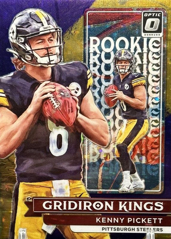 The Kenny Pickett 2022 Optic #RGK-1 Rookie Gridiron Kings - Purple Stars /25 card in Raw condition has not changed in price in the last 30 days and was last sold for $22.50 .