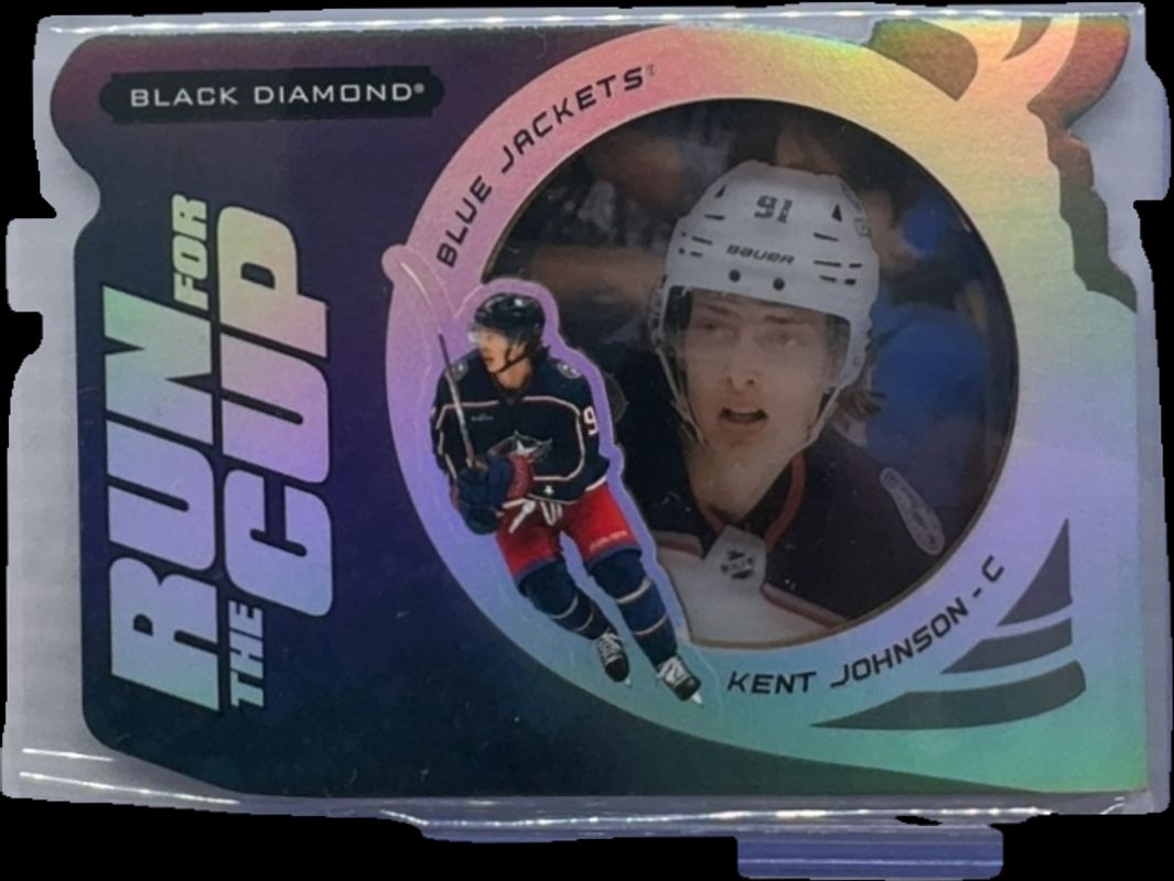 The Kent Johnson 2022 Upper Deck Black Diamond #RUN-KJ Run for the Cup /99 Rookie card is 1 of 61 Kent Johnson's card variations in the 2022 Upper Deck Black Diamond set being tracked by Sports Card Investor, including Base /349, Diamond Relic Rookie Gems /99, Red /75, Diamond Relic Rookie Gems Ruby /49, and Pure Black Autographs /49.