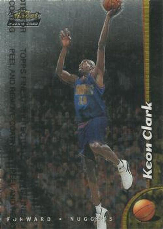 The Keon Clark 1998 Topps Finest #238 Base Rookie card is 1 of 4 Keon Clark's card variations in the 1998 Topps Finest set being tracked by Sports Card Investor, including Base - No Coating, Refractor, and Refractor - No Coating.
